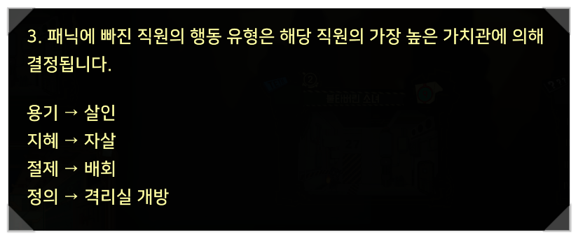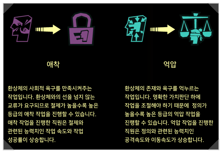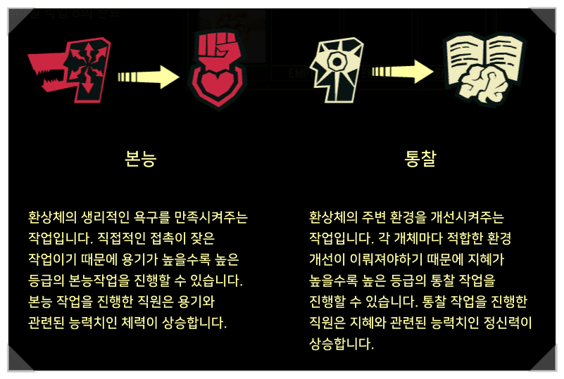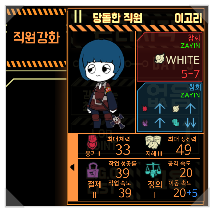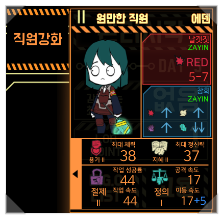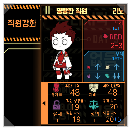 ( 체력 / 정신력 / 작업 속도 / 속도증가 )