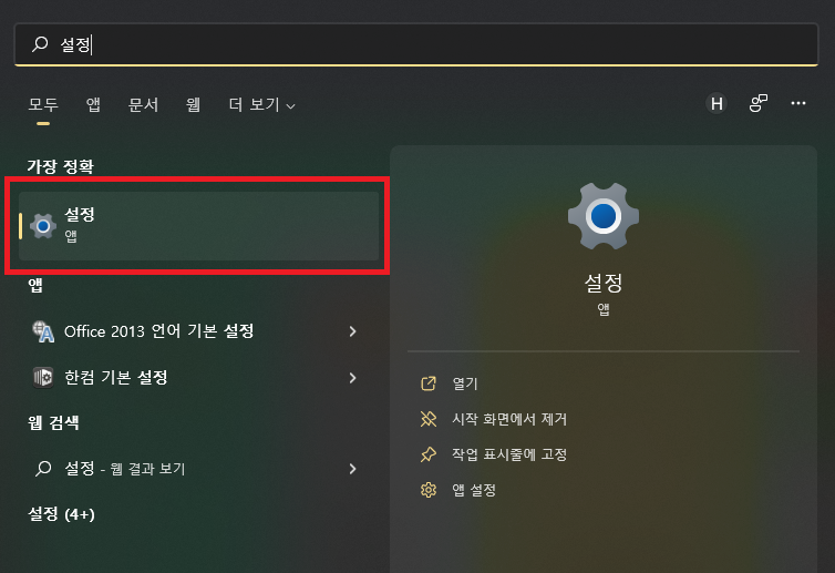 검색창에서 "설정"을 검색한 뒤...