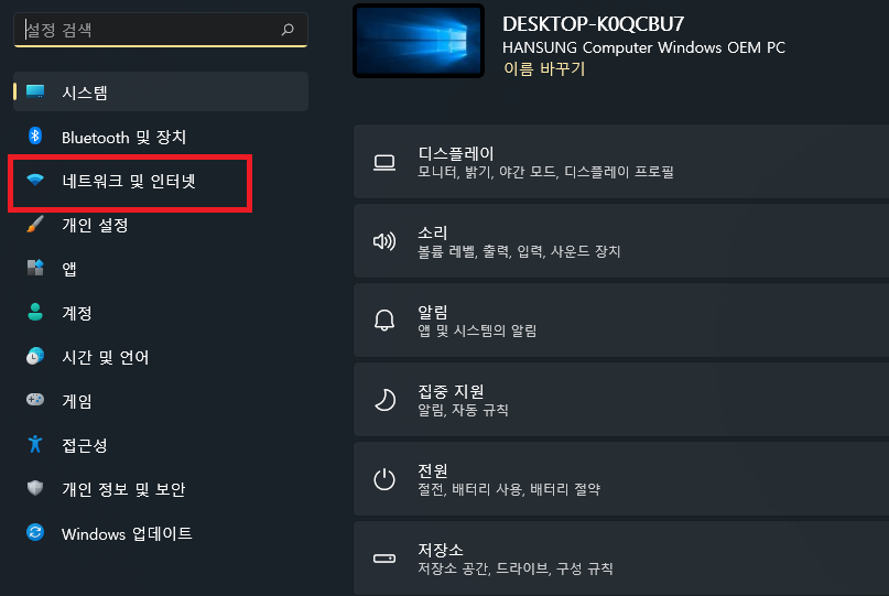 "네트워크 및 인터넷"을 클릭해주세요!