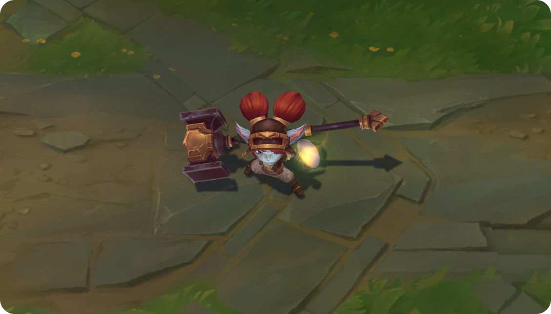 뽀삐가 망치를 휘둘러 피해를 입히고 적의 움직임을 느리게 만드는 지대를 생성합니다. 지대는 잠시 후 폭발합니다.