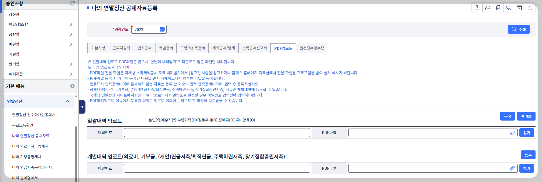 - 일괄내역 업로드에 연말정산 PDF 파일을 찾은 뒤 등록.