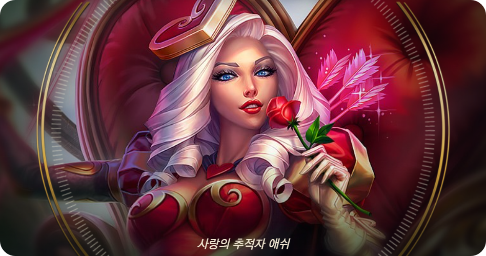 - 스토리: 사랑의 추적단 리더이자 자칭 사랑의 여왕 애쉬. 사랑의 계절이 다가올 때 그녀는 고통이나 슬픔 따위의 감정은 일체 용납하지 않습니다. 대신 세상을 사랑으로 물들입니다. 장거리용 무기로 말이죠.