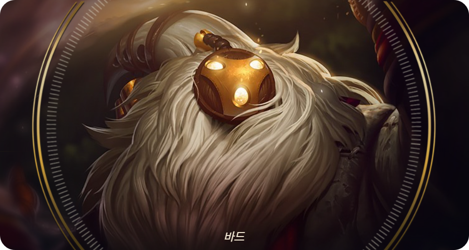 - 스토리: 별 너머에서 온 여행자 바드는 뜻밖의 발견과 예기치 않은 행운을 수호하며, 삶이 무심한 혼돈을 견딜 수 있도록 우주의 균형을 유지하기 위해 싸운다. 룬테라 인들은 바드가 신비하고 초월자적인 존재라는 내용의 노래를 곧잘 흥얼거리지만, 이 우주의 방랑자가 강력한 마법의 힘이 깃든 유물에 집착한다는 사실은 모든 룬테라 인이 동의하는 바다. 하지만 유익한 정령들이 내는 환희 어린 합창에 둘러싸인 바드가 악의를 지니고 있는 것은 아닐 터이다. 바드는 필멸의 존재보다 더 큰 선을 지키고자 할 뿐이다... 다만 그 방식이 기이할 뿐.