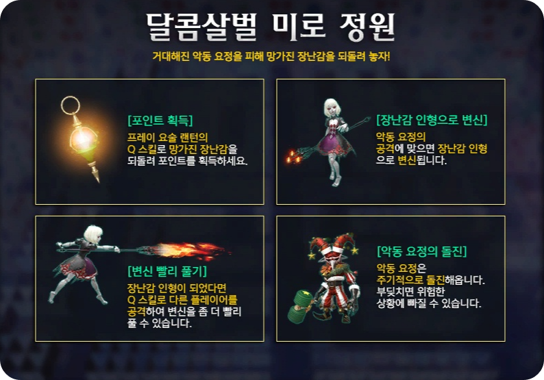 쫓아오는 악동 요정을 피해 망가지고 변해버린 장난감들을 원래대로 되돌려 주세요.