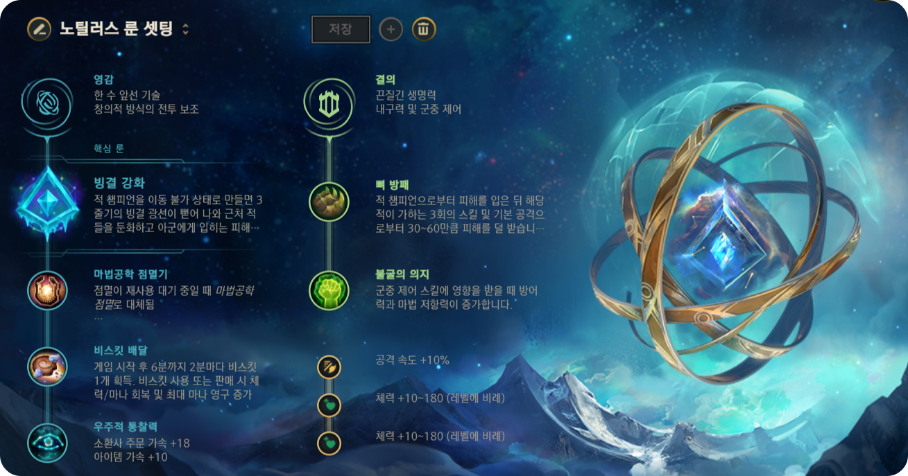 - 영감 [빙결 강화 / 마법공학 점멸기 / 비스킷 배달 / 우주적 통찰력]
