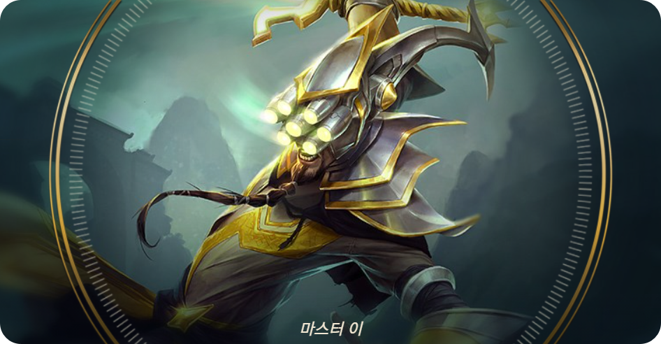 - 스토리: 마스터 이는 수련을 통해 심신을 갈고 닦아, 마침내 생각과 행동이 일치하는 경지에 이르렀다. 최후의 수단으로 무력을 사용할 것을 결심하기는 했지만, 마스터 이는 품위 있고 빠른 검 놀림으로 자신의 결단을 언제나 빠르게 수행했다. 아이오니아의 우주류 검술의 살아있는 마지막 전승자인 마스터 이는 자신의 '통찰의 칠안경'과 함께 제자가 되려는 후보자 중 가장 적합한 자를 꼼꼼히 조사하는 등 고향의 유산을 이어가는 데에 일생을 바친다.