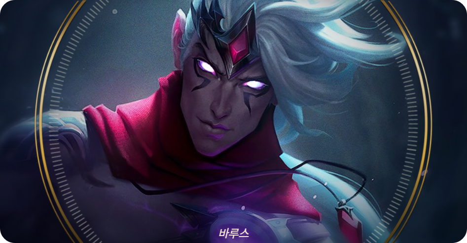 - 스토리: 바루스는 고대 다르킨 중 한 명으로, 적이 거의 미쳐 버릴 정도로 고통을 준 뒤에야 화살을 날려 숨통을 끊는 것을 즐기는 치명적인 암살자이다. 다르킨 전쟁 말미에는 갇히는 신세가 되었으나 몇백 년 후 아이오니아 사냥꾼 두 명의 육신을 빼앗는 방식으로 탈출했다. 두 사냥꾼은 자신들도 모르게 바루스를 풀어준 형국이 되었고 이제는 그의 육신이 되어 바루스의 정기가 갇힌 활을 짊어질 수밖에 없는 운명이 되었다. 바루스는 이제 잔인한 복수를 위해 자신을 가둔 자를 찾아다니지만, 내면에 있는 필멸자들의 영혼이 바루스에게 끈질기게 저항한다.