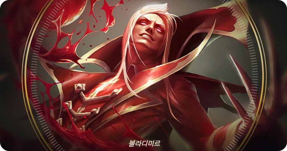 - 스토리: 필멸자의 피를 갈구하고 탐닉하는 블라디미르는 녹서스 건국 초기부터 제국에서 벌어지는 각종 사건에 영향을 끼쳤다. 수명을 비정상적으로 늘린 데다가, 피를 제어하는 능력을 이용해 다른 이들의 정신과 육체를 제 것인 듯 손쉽게 통제한다. 블라디미르의 이 능력은 녹서스 귀족 사회의 호화찬란한 살롱에서는 광적인 추종자 세력을 만드는 정도로 그치지만, 어두운 뒷골목에서는 적의 피를 마지막 한 방울까지 말려 버리는 데 쓰인다.