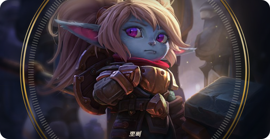 - 스토리: 룬테라에는 용맹한 챔피언이 넘쳐나지만 뽀삐만큼 끈기 넘치는 이는 찾아보기 힘들다. 제 키의 두 배는 되는 망치 오를론을 들고 다니는 뽀삐는 오랫동안 망치의 정당한 주인이자 전설의 주인공인 데마시아의 영웅을 찾아 비밀스럽게 헤매고 있다. 그 때까지 뽀삐는 충실히 전투로 돌격해 망치를 크게 휘둘러 왕국의 적을 모두 날려 버린다.