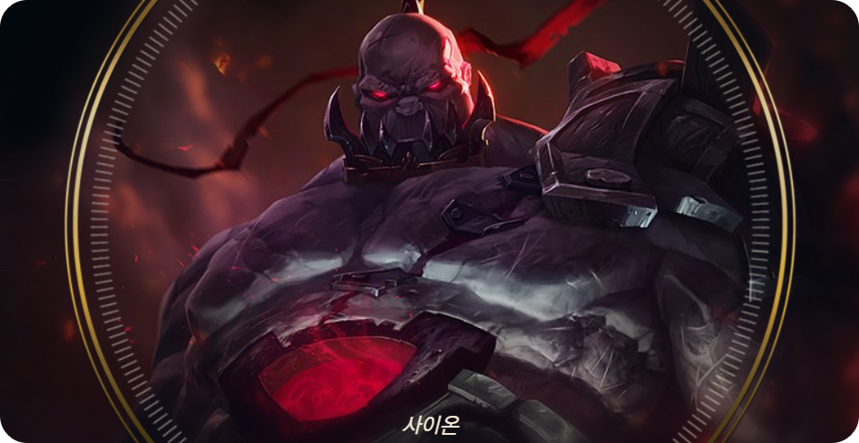 - 스토리: 과거 사이온은 데마시아 왕을 맨손으로 목 졸라 살해한 전공으로 녹서스에서 존경을 받았다. 이후에는 지나간 시대의 전쟁 영웅으로 잊혀질 뻔했으나, 죽은 후에 부활하여 다시금 녹서스에 충성을 다하게 되었다. 부활한 사이온은 썩어버린 육체에 조악한 방어구를 고정시켜 걸치고, 자신의 앞을 가로막는 자라면 충성 여부에 상관없이 닥치는 대로 학살했다. 죽기 전의 인간성이 더 이상 남아 있지 않는 것이었다. 하지만 그렇게 앞뒤 재지 않고 무작정 전장으로 뛰어들면서도, 사이온이 휘두르는 도끼날에는 진정한 자아를 기억해 내고 싶다는 열망이 숨어 있다.
