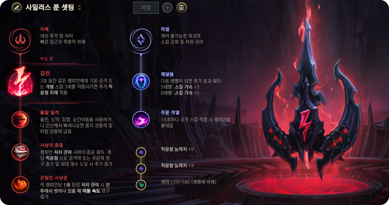 - 지배 [감전 / 돌발 일격 / 사냥의 증표 / 끈질긴 사냥꾼]