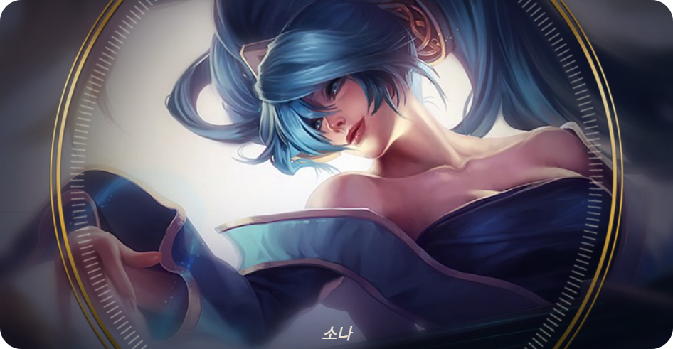 - 스토리: 소나는 현악기 에트왈 연주에서 데마시아 제일가는 거장으로, 말을 하지 못하며 오로지 우아한 화음과 심금을 울리는 아리아로만 의사를 표현한다. 특유의 고상한 몸가짐 때문에 데마시아 상류층의 사랑을 받지만, 듣는 이의 마음을 사로잡는 소나의 선율이 실제로 마법이 아닌가 의심하는 사람들도 많다. 알다시피 마법은 데마시아에서 금기시되고 있기 때문이다. 소나는 낯선 이들에게 침묵을 지키지만, 가까운 지인들의 그녀의 의사를 어느 정도 이해한다. 소나가 연주하는 화음은 아군의 상처를 어루만질 뿐 아니라 방심하고 있는 적을 공격하기도 한다.