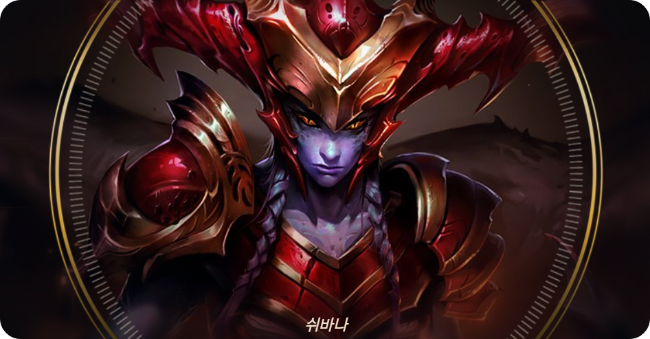 - 스토리: 쉬바나는 심장 속에서 불타는 룬 조각 덕분에 마력을 발휘하는 존재로, 평소에는 인간의 모습을 하고 있으나 사실은 강력한 힘을 지닌 용이다. 용의 형상으로 변하면 불타오르는 숨결로 적을 그 자리에서 태워버린다. 자르반 4세의 목숨을 구해준 후 그의 친위대에 들어갔지만, 데마시아 인들은 여전히 쉬바나에게 미심쩍은 눈길을 보내고 있다. 쉬바나로서도 친위대원 노릇이나 데마시아 인물의 신임을 받는 일이 쉽지만은 않다.