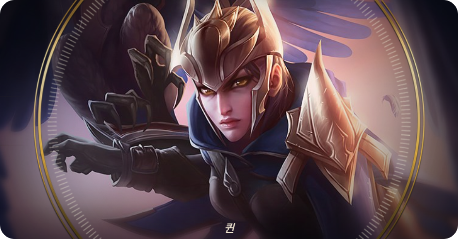 - 스토리: 데마시아의 정예 기동대 기사인 퀸은 전설적인 독수리 발러와 함께 적의 영토 한복판에 잠입해 갖가지 위험한 임무를 수행한다. 퀸과 발러의 강력한 결속력은 전투에서 무시무시한 힘을 발휘한다. 적들은 그들의 상대가 데마시아 제일가는 영웅, 그것도 하나가 아니라 둘이라는 사실을 알지도 못한 채 순식간에 목숨을 잃고 만다. 상황에 따라 곡예 수준의 동작을 보여주는 퀸이 민첩한 몸놀림으로 석궁을 꺼내들면, 발러는 공중에서 유영하며 숨어 있는 적을 찾아낸다. 데마시아의 적에게는 그야말로 공포의 한 쌍이다.