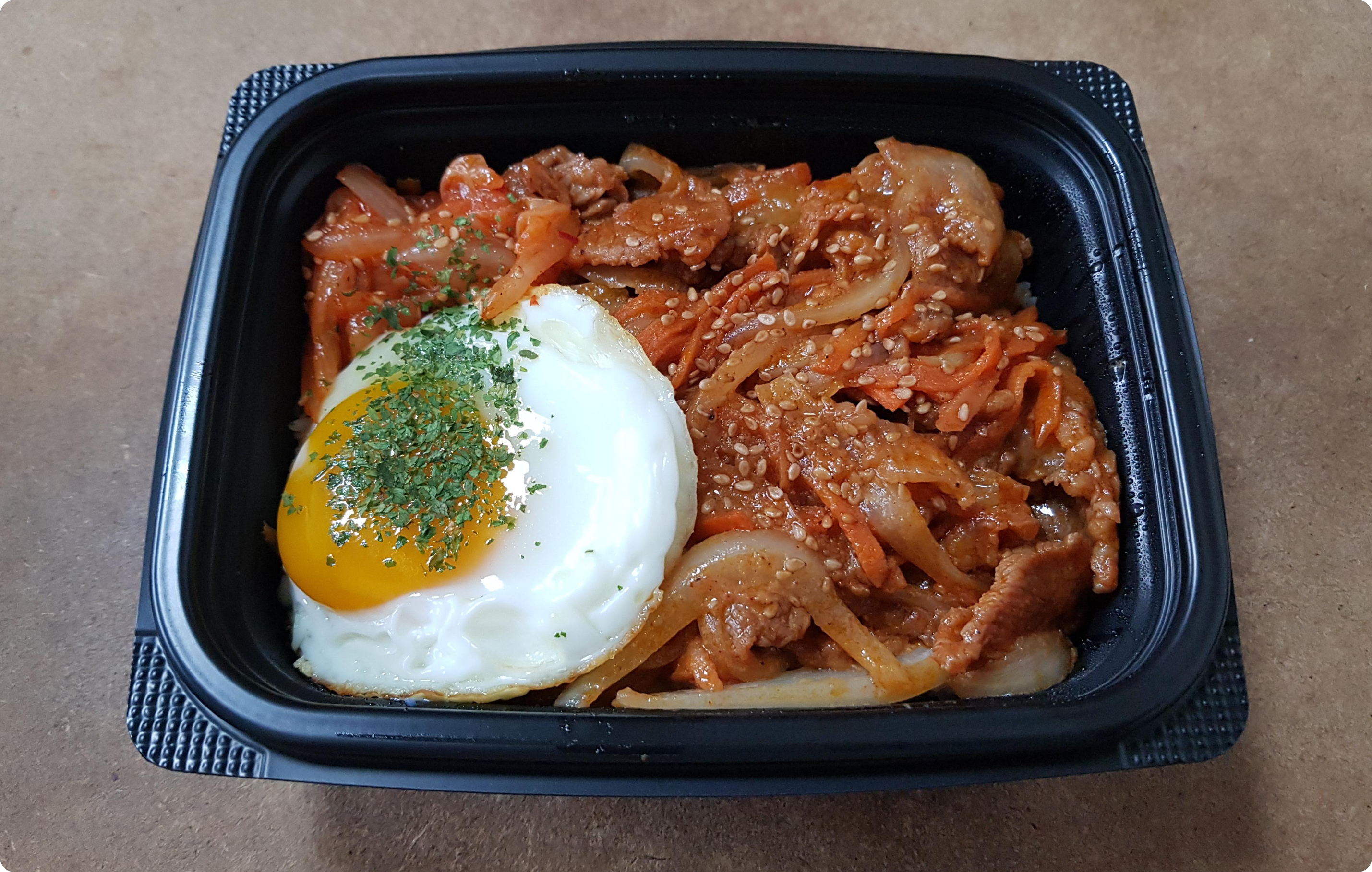 [ 구성: 반숙 계란, 볶음 김치, 당근과 양파가 가득한 제육볶음 ]