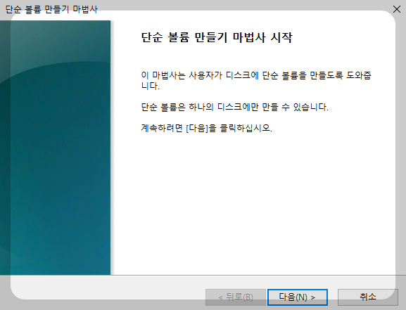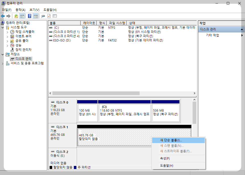 마우스 오른쪽 클릭, " 새 단순 볼륨 " 클릭.