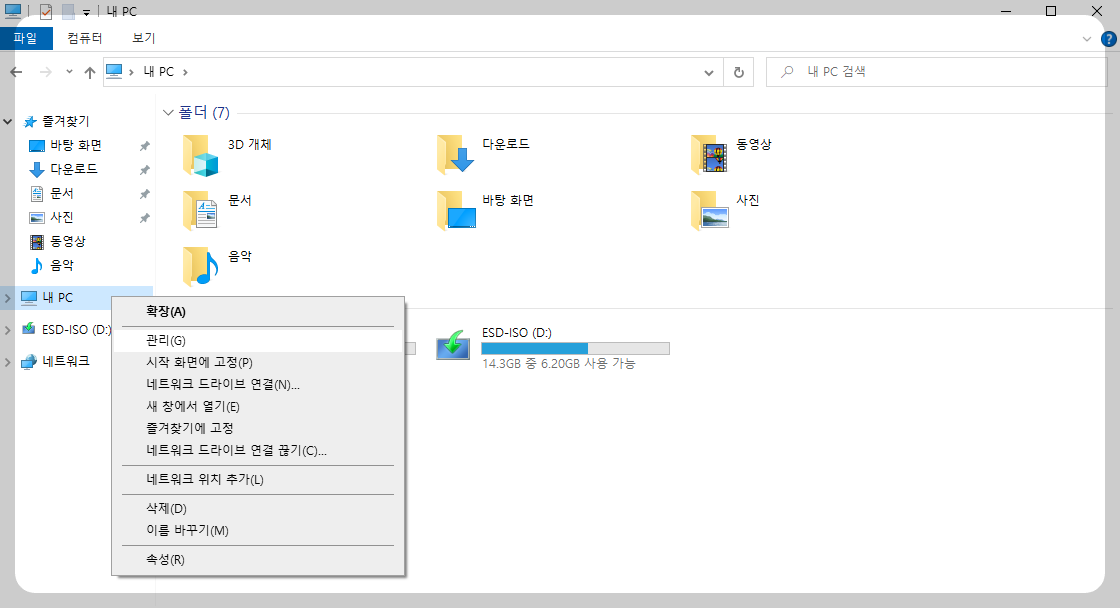 1. " 내 PC " 마우스 오른쪽 클릭 후 " 관리 " 클릭.