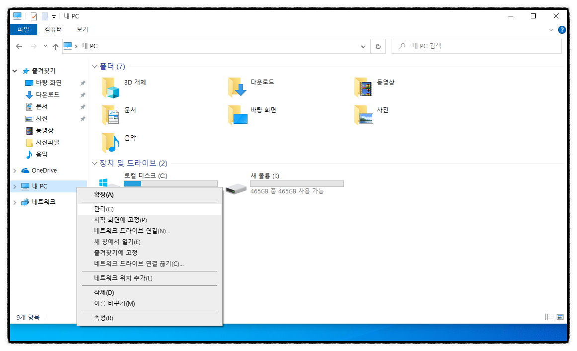 1. " 내 PC " 마우스 오른쪽 클릭 후 " 관리 " 클릭.