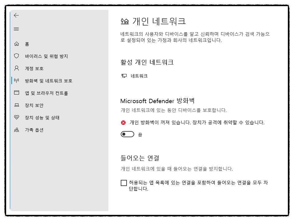 2. " 개인 네트워크 " 클릭 후 " Microsoft Defender 방화벽 " 끄기.