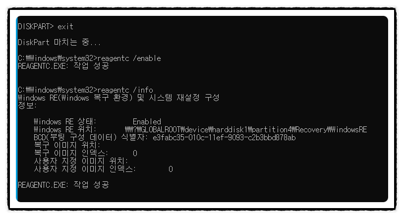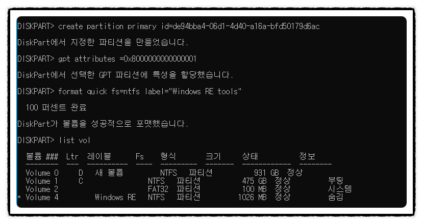 3. format quick fs=ntfs label="Windows RE tools" 입력