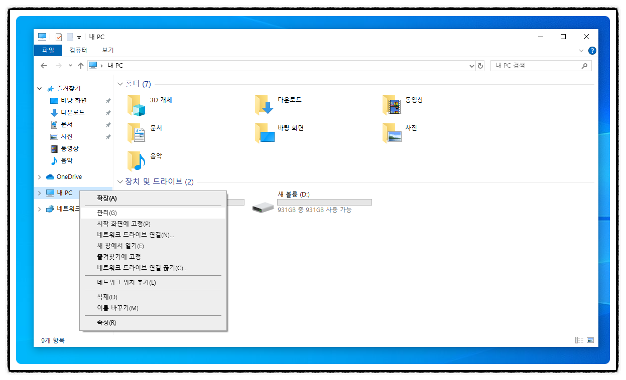 " 내 PC " 마우스 오른쪽 클릭 후 " 관리 " 클릭.