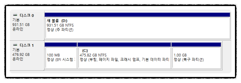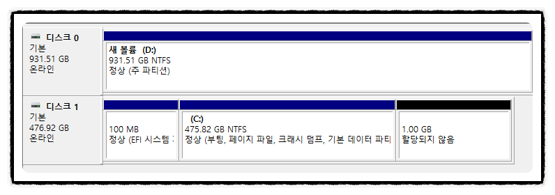 저 같은 경우에는 디스크 1에 복구 파티션이 있었습니다.