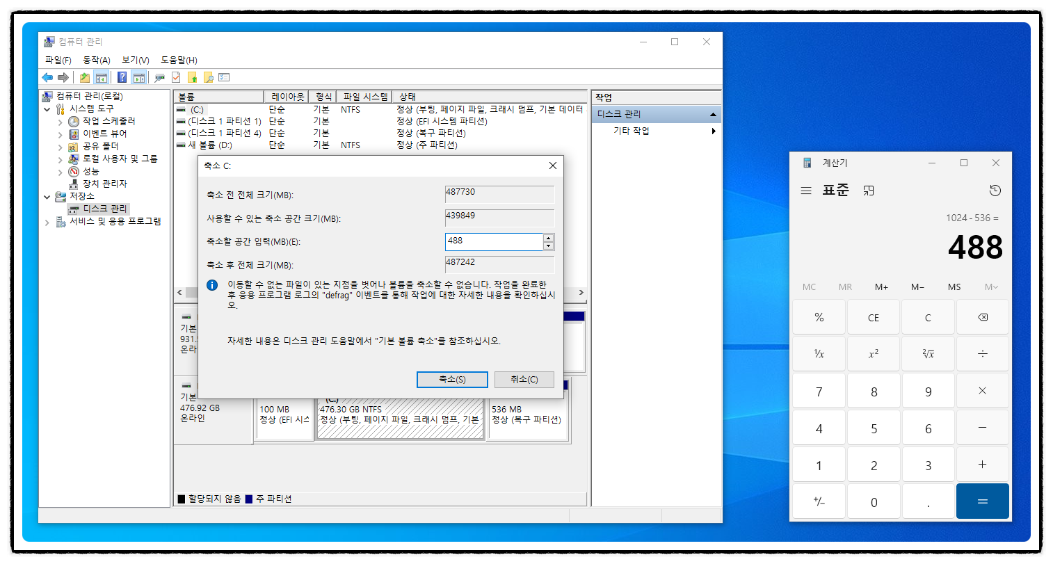 복구 파티션의 부족한 용량만큼 축소시켜주세요.