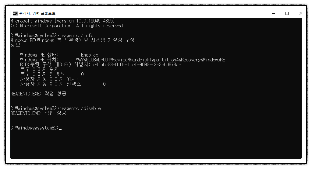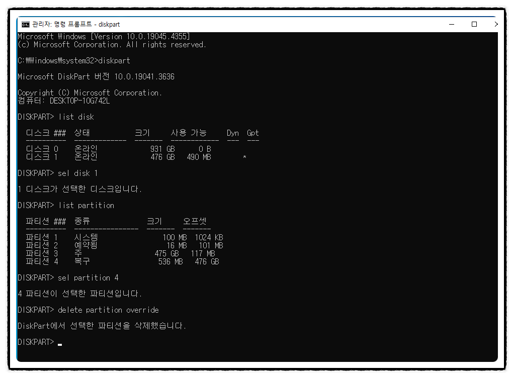 컴퓨터마다 복구 파티션의 용량이 다 다릅니다...
