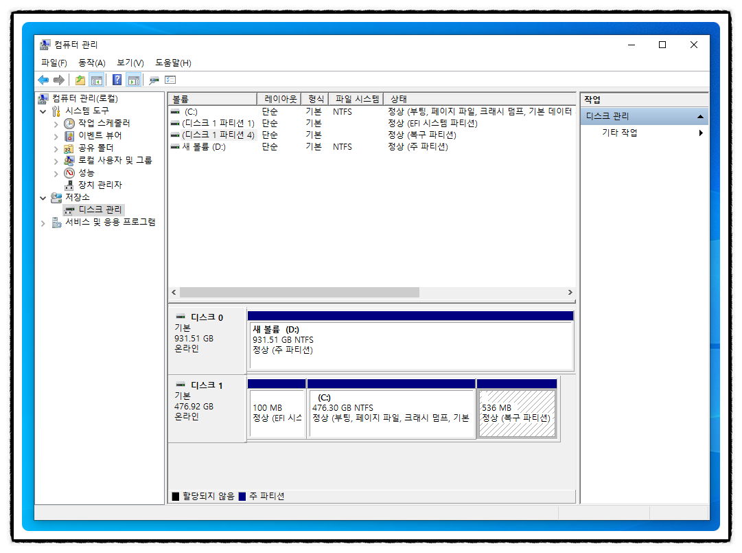 저장소에 있는 " 디스크 관리 " 클릭 후