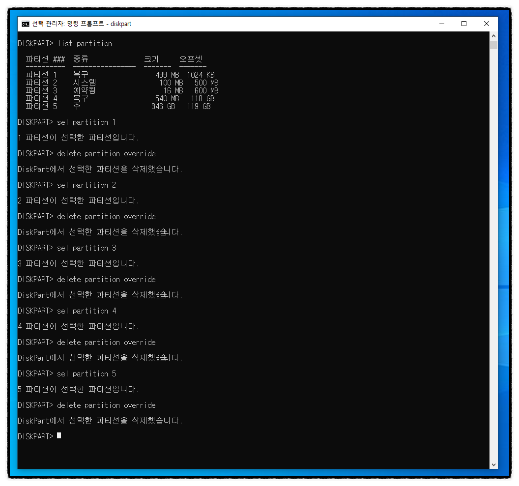 그랬더니 디스크 0번 복구 파티션이 없어졌네요.