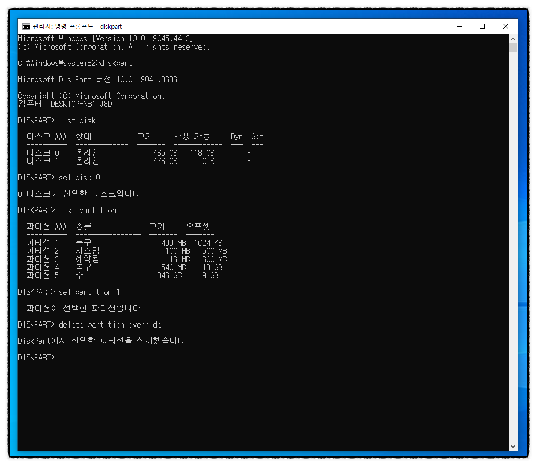 1번 파티션을 삭제했습니다.