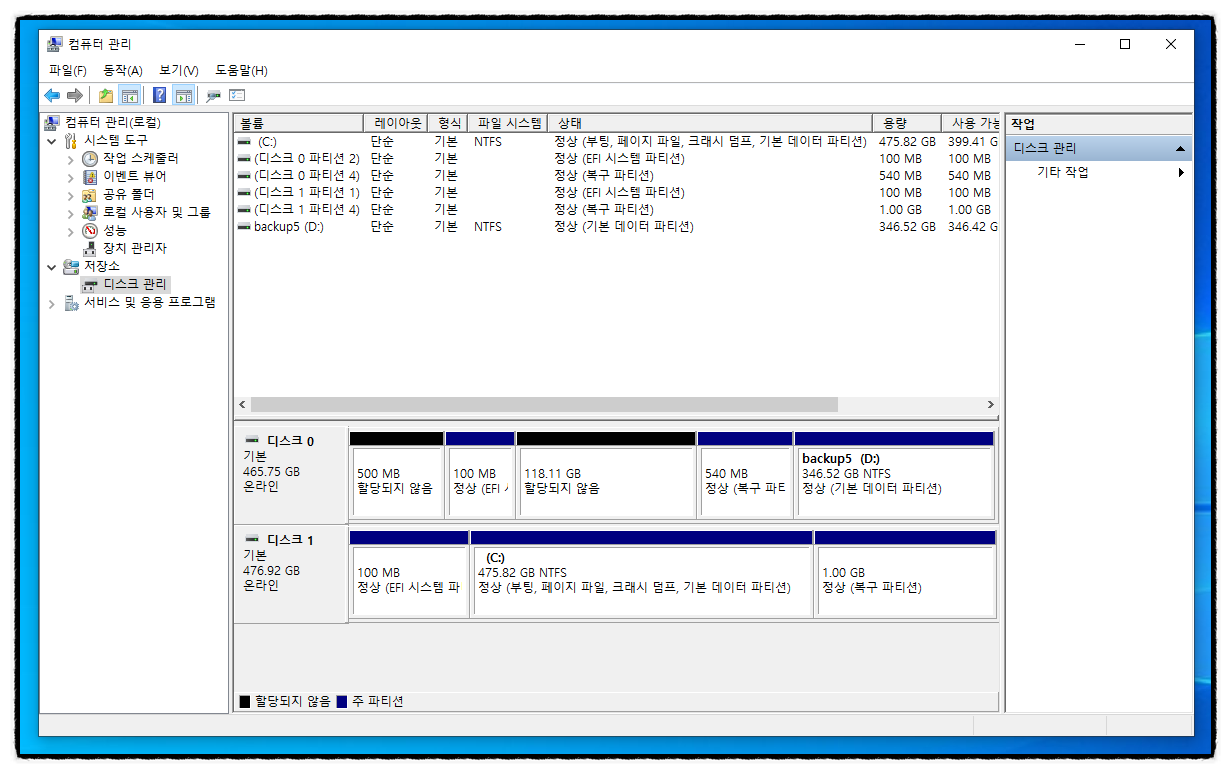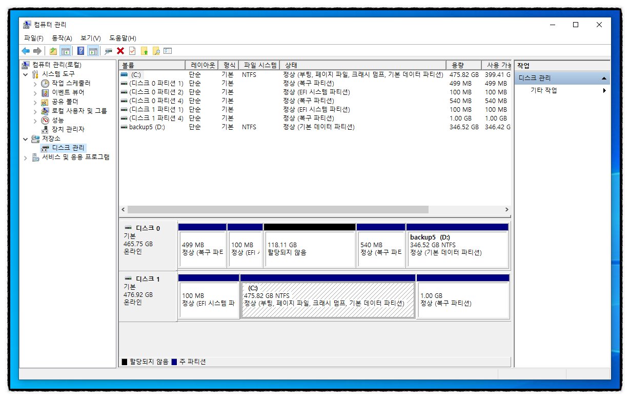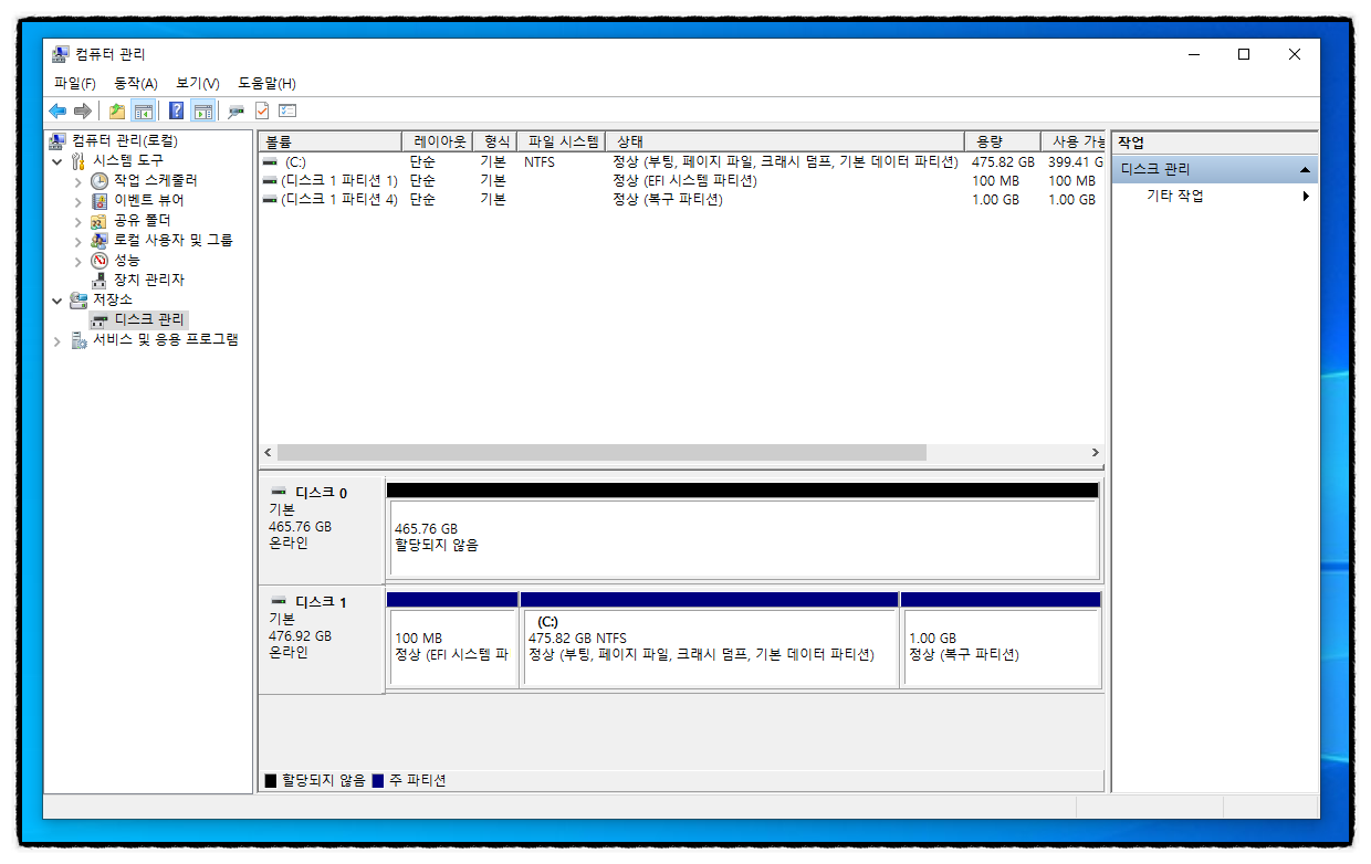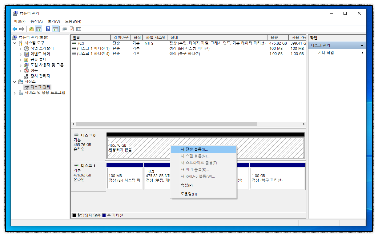 저장소 밑에 있는 " 디스크 관리 " 클릭 후