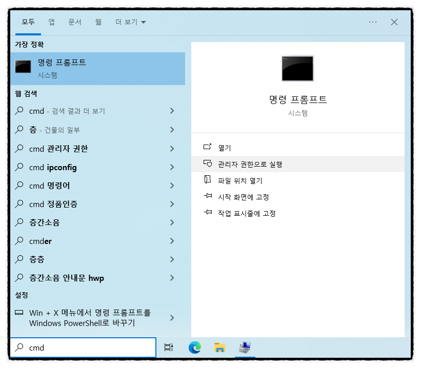 검색창에 " cmd " 검색 후 " 관리자 권한으로 실행 " 클릭