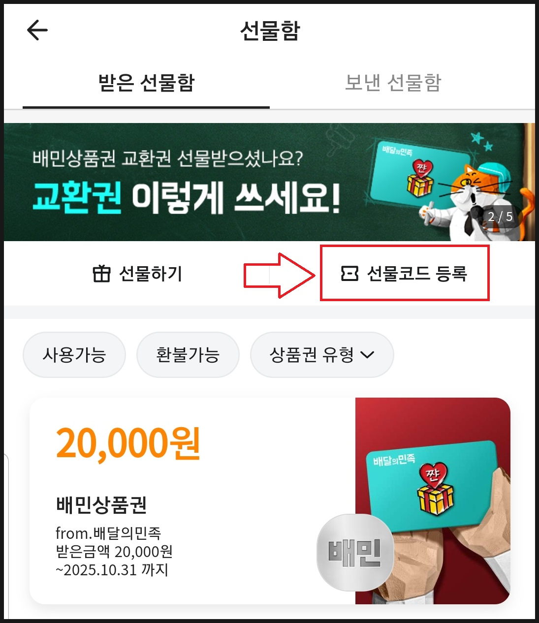 5. 선물받은 배민상품권 등록하기.