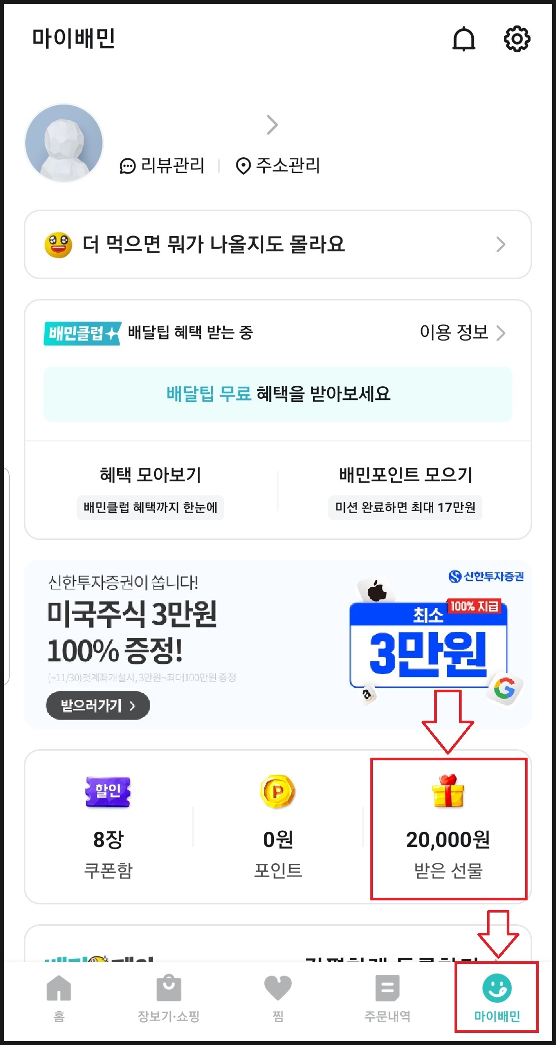 3. 마이배민에 있는 " 받은 선물 " 클릭하기.