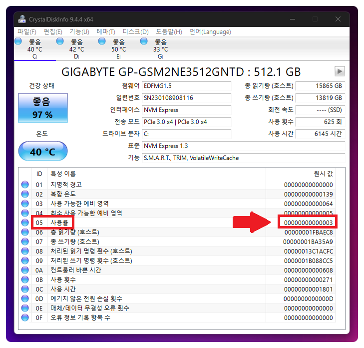[[[ 05 재할당된 섹터 수 / 사용률 ]]]