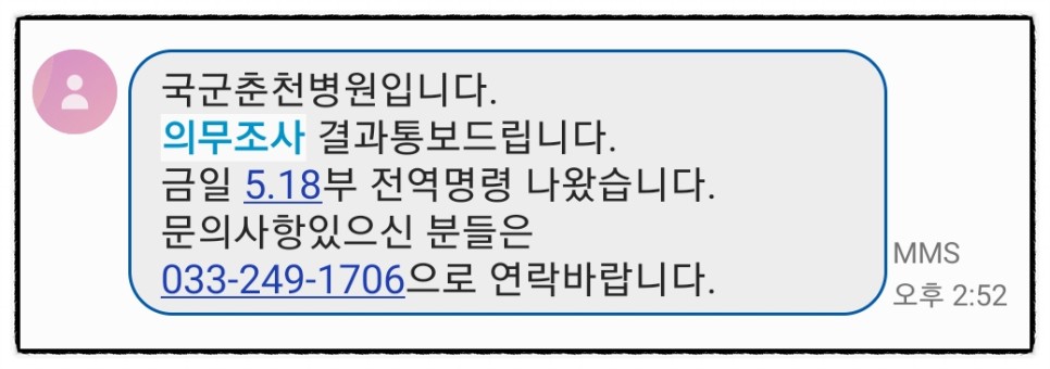 기다리고 기다리다 국군춘천병원에서 문자로 통보해줌
