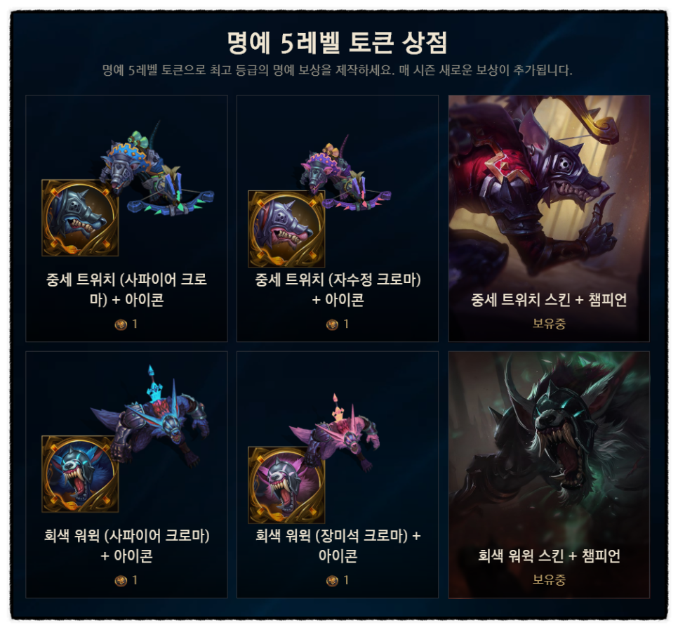 - 워윅, 트위치, 이렐리아, 명예 5레벨 토큰,